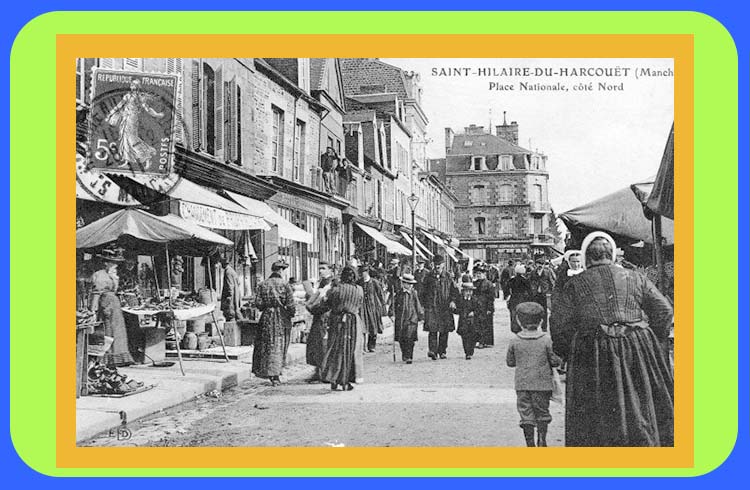 Vers 1900 au carrefour place du Bassin avec en face l'entrée de la rue de Mortain